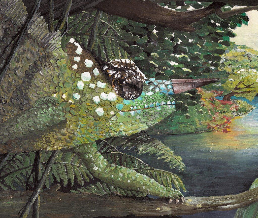 This painting represents the topic of imprisonment / freedom. The chameleon steps out of the darkness and the tangle of lianas in the direction of light and his body adapts by the new color mood.