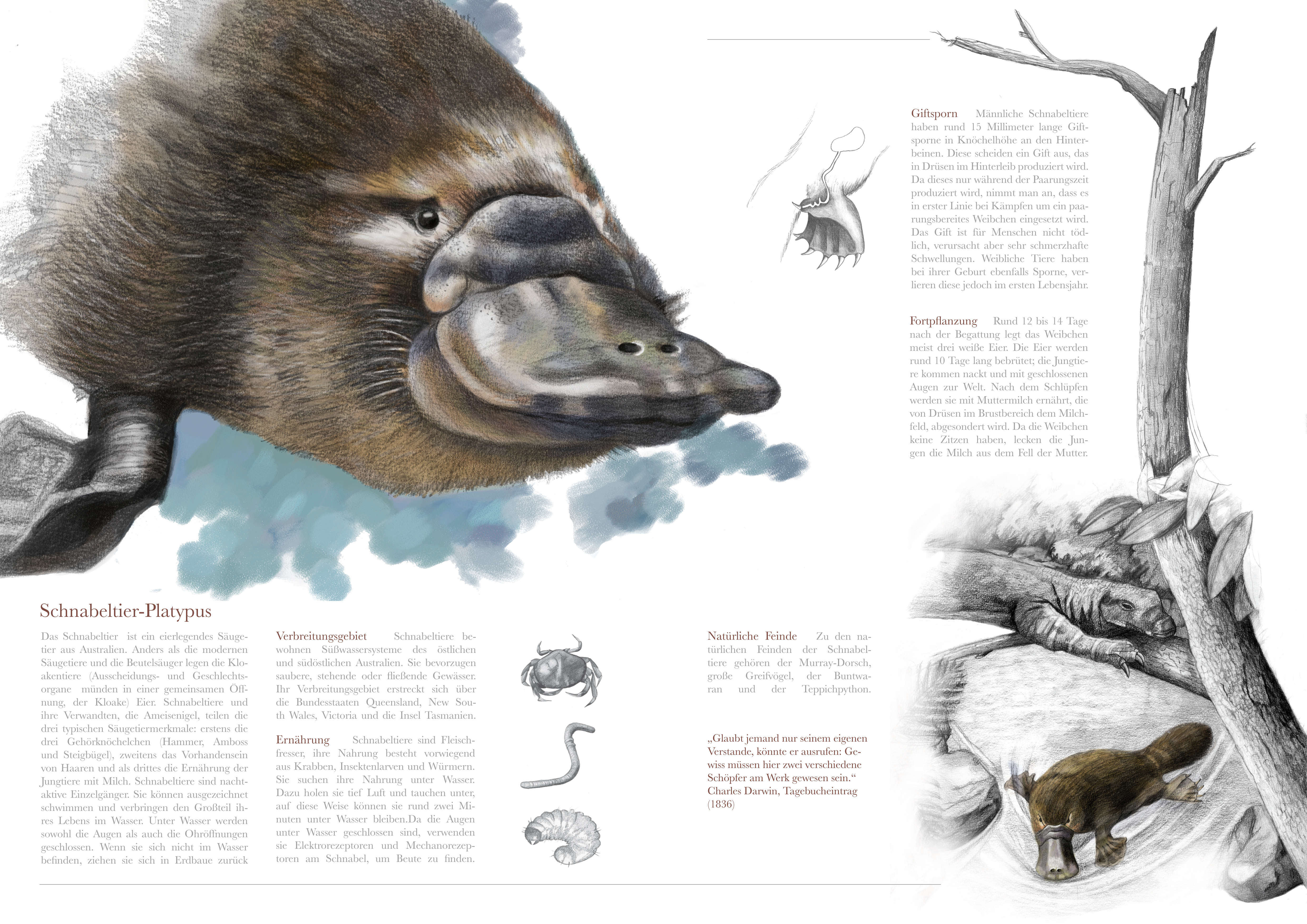 Project work while studying at the HSLU illustrates the habitat, diet, reproduction, and special features of the platypus.